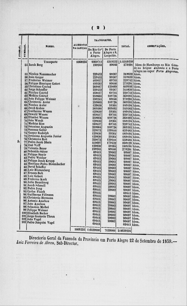 Este documento está disponível online no site da Hemeroteca Digital Brasileira, onde consta em relatório do conselheiro Angelo Moniz Silva Ferraz entregue a Presidência da Província de S. Pedro do Rio Grande do Sul em 1859. No relatório, consta: “Conta das despezas feitas por emprestimo, pelo cofre provincial com os colonos estabelecidos na colonia de S. Leopoldo, abaixo mencionados que chegárão á esta Capital ao 1.º de Janeiro, 11 de Março e 19 de Julho de 1847, os quaes assignárão termos em que se obrigárão a indemnizar as referidas despezas dentro do prazo de tres annos por intermedio da Camara Municipal do mesmo lugar; o que ainda não se realisou”.