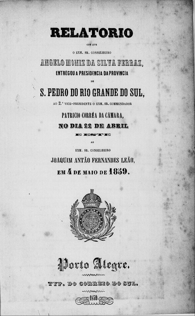 RIO GRANDE DO SUL (Província). Relatório com que o Exm. Sr. Conselheiro Angelo Moniz da Silva Ferraz entregou a presidência da Província de S. Pedro do Rio Grande do Sul. Porto Alegre: Typ. do Correio do Sul, 1859. Disponível em: https://memoria.bn.gov.br/DocReader/DocReader.aspx?bib=252263&Pesq=Winck&pagfis=1729. Acesso em: 23 abr. 2026.